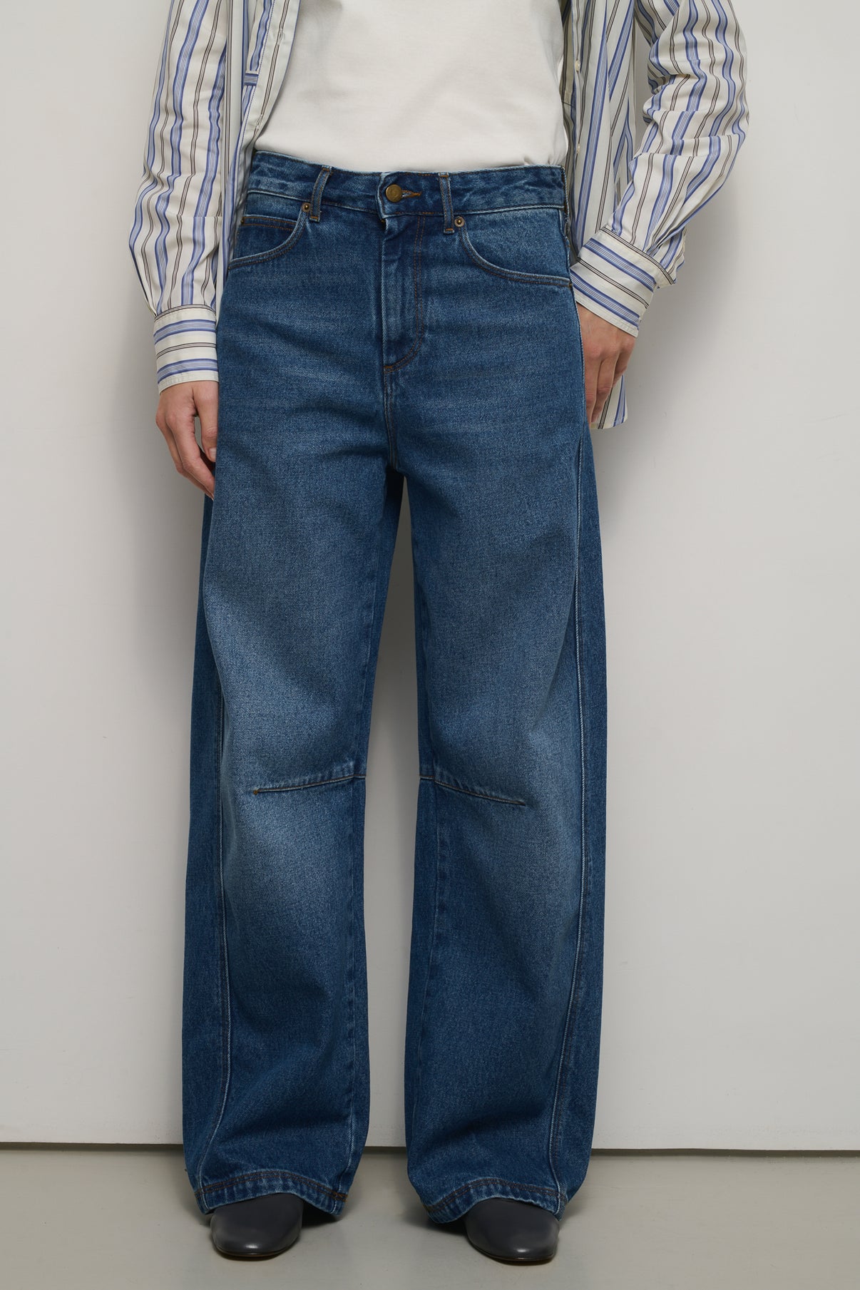 ELIOTT is a wide-leg denim jean, already a Soeur wardrobe essential. Rounded leg with knee darts and cropped ankle length elongate the silhouette. Blue denim version is soft and comfortable.